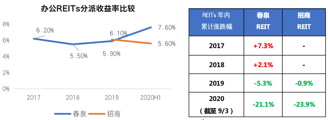 擁有辦公資產的兩只REITs分別為春泉產業信托(下稱春泉REIT)及招商房地產信托(下稱招商REIT)。春泉REIT在內地僅一處資產,位于北京市朝陽區建國路,是北京核心CBD區域,交通便利,位置優越,連年保持高于市場平均水平的出租率。招商REIT在擁有四處辦公資產及一個商業資產,均位于深圳前海蛇口自由貿易區的核心區域。