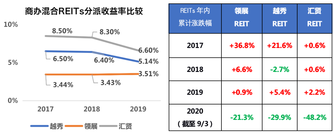 另一方面,近3年底層資產運營效率一直有所下滑的匯賢REIT的分派收益率也在不斷下滑,2019年較2018年下降1.7個百分點,下降幅度較大,這主要是由于2019年營商環境較為困難,持有物業收入減少,同時為了維持物業平穩運營,保持充足的營運現金流,將分派比例由100%將至90%,造成2019年整體收益率下降。