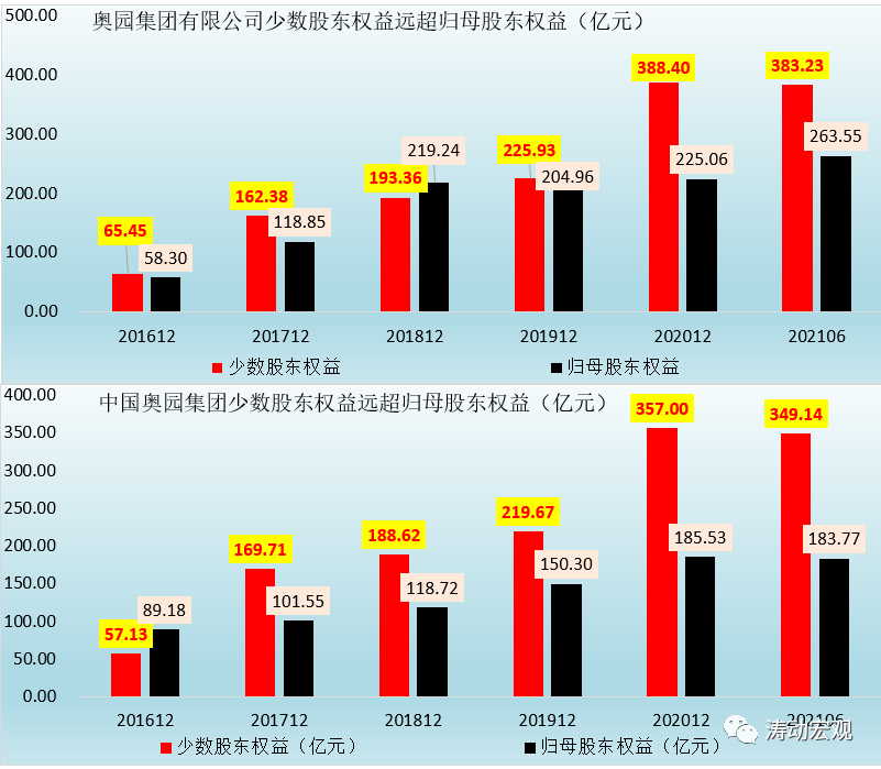 3、雖然奧園表面上帶息債務約1200億元左右,和3000億元左右的總資產相比,債務情況并不高,但奧園主要是依靠少數(shù)股東的出資為其擴張?zhí)峁┵Y金。特別是我們看到,中國奧園的少數(shù)股東權益已經遠遠超過歸母股東權益了。
