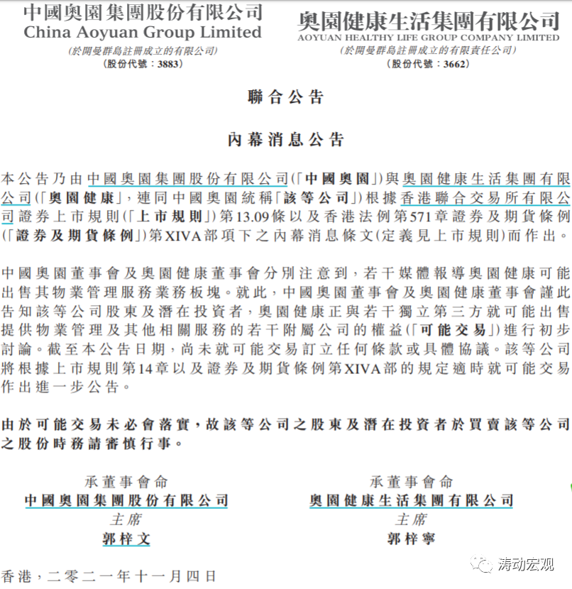 1、2021年11月3日,有媒體報道稱,為緩解流動性壓力,中國奧園擬出售旗下物業(yè)公司奧園健康控股股權,已接觸合生創(chuàng)展等多個買家,并希望11月底前能夠完成。2021年11月4日,中國奧園、奧園健康聯(lián)合發(fā)布公告稱“奧園健康正與若干獨立第三方就可能出售提供物業(yè)管理及其他相關服務的若干附屬公司的權益進行初步討論,截至目前尚未就可能交易訂立任何條款或具體協(xié)議”。