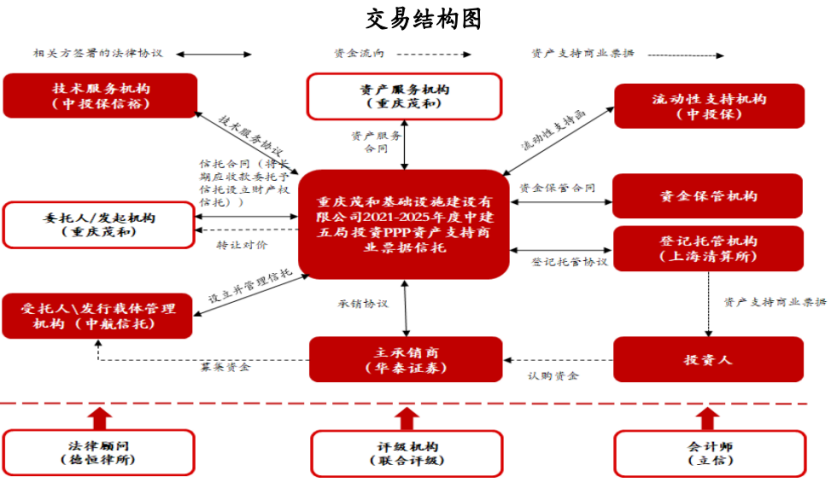 PPP項目收益率比較低,但是考慮到通常情況下入庫項目資質較好,融資不難且利率非常低。如此以來,PPP項目證券化首要面臨的問題就是證券端利率和PPP項目融資利率之間的倒掛。但是ABCP通過縮短期限降低發行利率,很好的解決了這個問題,PPP的證券化未來又可期了不少。今天來看一單新項目——重慶茂和基礎設施建設有限公司2021年度第一期中建五局投資PPP資產支持商業票據,具體了解一下PPP和ABCP碰撞出來的火花,項目尚在協會預評中。