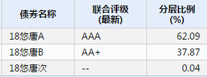 其二,完全不出表,這種情況比較常見。實踐中,ABS往往設(shè)定“優(yōu)先/次級結(jié)構(gòu)”、“原始權(quán)益人差額補足”、“母公司/關(guān)聯(lián)方擔保”等增信條款,在這些增信下,往往是不出表或者部分出表。如果是全額差額補足、或者自己持有的次級占整個ABS規(guī)模的一定比例(實際操作中一般以10%為限)以上,則完全不能出表,如果低于這個比例,則可按繼續(xù)涉入的原則做到部分出表。以兆泰集團發(fā)行的悠唐中心CMBS為例(分層情況見表1),雖然次級只有0.04%的份額,但因為原始權(quán)益人兆泰集團對ABS提供差補承諾,則此基礎(chǔ)資產(chǎn)也無法出表。那么,發(fā)行ABS后,其資產(chǎn)負債表將體現(xiàn)為貨幣資金增加,其它非流動負債、其它流動負債或一年內(nèi)到期的非流動負債增加(相當于一種存在抵質(zhì)押的債權(quán)融資)。