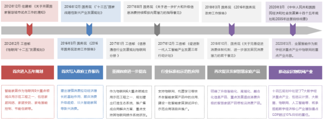 隨著物聯網上升為國家發展戰略,近年來,智能家居作為重點應用頻繁出現在中央和地方政策當中,有關支持智能家居行業發展的政策早在十三五規劃中就已經提及。