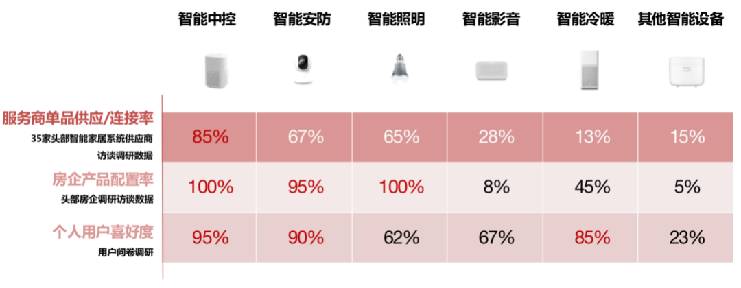 本輪《意見》的發布同時也給智能設備的供應商和系統商帶來了新的機遇,針對智能家居產品的實際應用情況,克而瑞分別從供應端、房企配置率和用戶偏好三個角度對智能家居產品的應用程度進行調研分析,發現除了安防、照明等基礎應用關注度較高以外,智能中控系統已經成為各方最為關注的焦點。