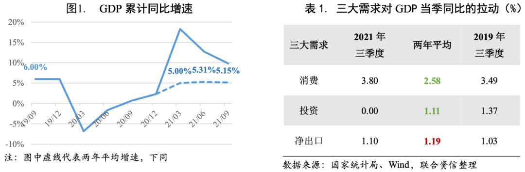 三季度經(jīng)濟(jì)修復(fù)放緩。三季度我國國內(nèi)生產(chǎn)總值29.10萬億元,同比增長4.90%,兩年平均增長4.90%,較二季度兩年平均增長(5.52%)有所放緩;三季度環(huán)比增長0.20%也較二季度(1.20%)明顯回落,三季度經(jīng)濟(jì)修復(fù)動能減弱,消費和投資對經(jīng)濟(jì)增長的拉動均不及疫情前同期,僅凈出口拉動作用高于疫情前。2021年前三季度,我國國內(nèi)生產(chǎn)總值82.31萬億元,不變價累計同比增長9.80%,兩年平均增長5.15%,較上半年兩年平均增速放緩0.16個百分點。