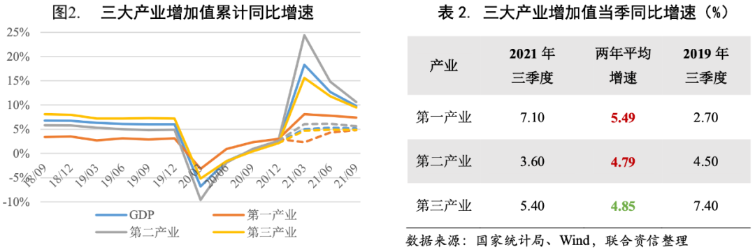 從三大產(chǎn)業(yè)來看,三季度第一、二產(chǎn)業(yè)增加值兩年平均增速[2]均高于疫情前2019年同期的水平,恢復(fù)情況良好;而第三產(chǎn)業(yè)增加值兩年平均增速仍未回到疫情前水平,主要是服務(wù)業(yè)受局部疫情反復(fù)影響較大。