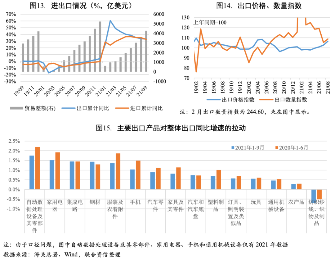 三季度出口增速有所放緩,主要是由于上年基數(shù)抬高。全球經(jīng)濟(jì)和貿(mào)易回暖帶來的需求增加是支撐我國出口的主要因素,但三季度以來出口價格上漲對出口金額的貢獻(xiàn)度上升,集成電路、手機(jī)和家用電器等受大宗商品漲價明顯的行業(yè),出口均表現(xiàn)出量減價增的特點。從三季度主要出口產(chǎn)品對整體出口同比增速的拉動來看,自動數(shù)據(jù)處理設(shè)備及其零部件、家用電器和集成電路依然是出口的最大拉動項;紡織紗線、織物及制品對出口的負(fù)向拉動進(jìn)一步增大。四季度,海外需求修復(fù)疊加出口價格上漲或?qū)⒅纬隹谝廊槐3衷谳^高的水平,但在上年基數(shù)抬高的因素影響下,四季度整體出口增速將小幅下行。
