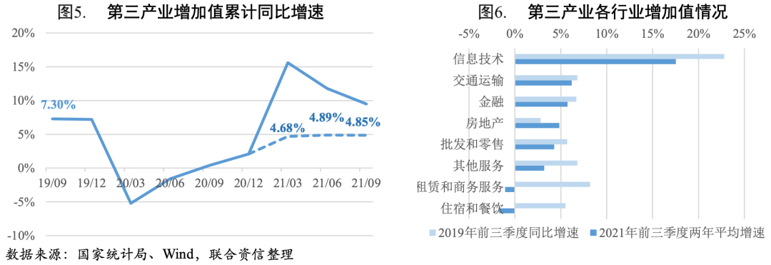 三季度服務(wù)業(yè)生產(chǎn)小幅回落。三季度第三產(chǎn)業(yè)增加值當(dāng)季同比增長5.40%,兩年平均增長4.85%,較二季度(5.05%)有所回落。前三季度第三產(chǎn)業(yè)增加值累計同比增長9.50%,兩年平均增長4.85%,與上半年兩年平均增速略有下降,服務(wù)業(yè)仍有較大的向上修復(fù)空間。9月服務(wù)業(yè)生產(chǎn)出現(xiàn)積極變化,或是疫情影響減弱以及中秋節(jié)小長假帶動服務(wù)業(yè)向好。第三產(chǎn)業(yè)主要行業(yè)[4]中僅房地產(chǎn)行業(yè)增加值兩年平均增速恢復(fù)至疫情前水平,住宿和餐飲、租賃和商務(wù)服務(wù)業(yè)拖累明顯,兩年平均增速仍處于負(fù)值區(qū)間。