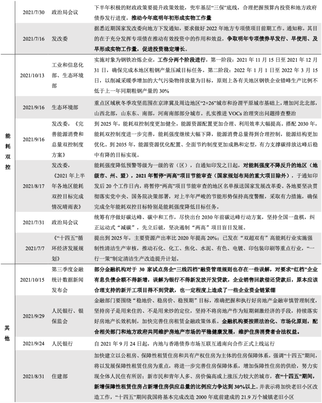 2021年三季度,貨幣政策方面,年內(nèi)首次下調(diào)金融機(jī)構(gòu)存款準(zhǔn)備金率0.5個百分點釋放長期資金約1萬億元,新增3000億元支小再貸款額度加大支持小微企業(yè)力度,整體來看三季度信貸總量增長穩(wěn)定,同時突出信貸結(jié)構(gòu)調(diào)整;財政政策方面,地方政府債的發(fā)行進(jìn)度有所加快,財政支出呈增長趨勢。“碳中和”要求與“能耗雙控”行動下,限電限產(chǎn)政策在三季度有所加碼。