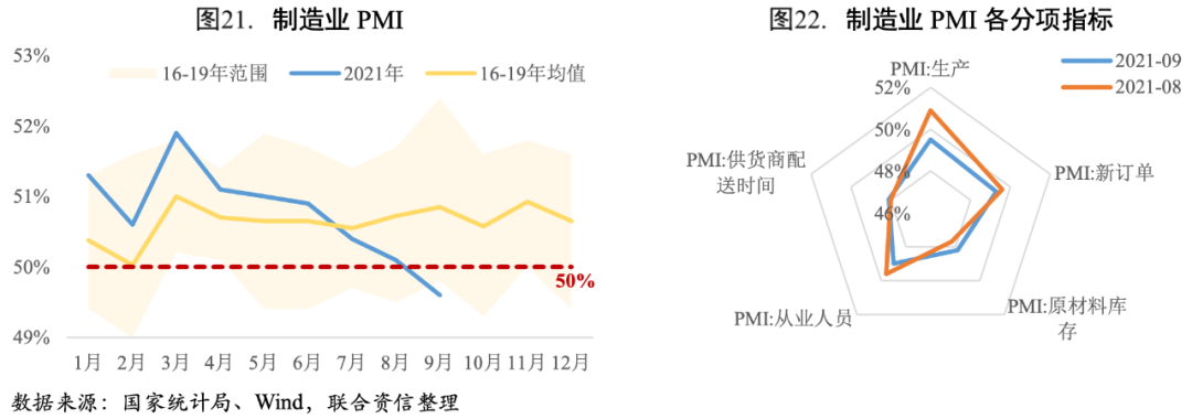 2021年三季度制造業(yè)PMI呈現(xiàn)逐月小幅下降的趨勢,9月制造業(yè)PMI跌至49.6%,產(chǎn)需兩端均降至榮枯線下,制造業(yè)生產(chǎn)活動和市場需求總體放緩。從行業(yè)角度看,在調(diào)查的21個行業(yè)中,有12個高于臨界點,比上月增加2個,但石油煤炭及其他燃料加工、化學(xué)纖維及橡膠塑料制品、黑色金屬冶煉及壓延加工等高耗能行業(yè)生產(chǎn)和新訂單兩個指數(shù)均進(jìn)一步下滑至45.0%以下,反映了9月制造業(yè)PMI降至榮枯線下更多的是受高能耗行業(yè)影響。