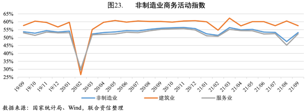 2021年三季度非制造業(yè)商務(wù)活動指數(shù)呈現(xiàn)V型,8月降至榮枯線以下,9月重回擴(kuò)張區(qū)間。9月份,非制造業(yè)商務(wù)活動指數(shù)為53.2%,高于上月5.7個百分點,升至臨界點以上,非制造業(yè)景氣水平快速回升,其中服務(wù)業(yè)恢復(fù)明顯,建筑業(yè)仍位于較高景氣區(qū)間。
