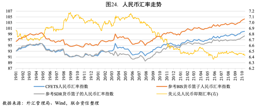 2021年以來,美元兌人民幣匯率雙向?qū)挿▌樱径纫詠聿▌訁^(qū)間收窄;人民幣三大匯率指數(shù)延續(xù)2020年下半年以來的升值趨勢,主要是由于我國經(jīng)濟(jì)相對較好且國內(nèi)疫情顯著好于海外,支撐人民幣匯率指數(shù)堅挺。四季度,預(yù)計人民幣三大匯率指數(shù)或?qū)⑿》H值,主要是由于四季度我國經(jīng)濟(jì)恢復(fù)的挑戰(zhàn)增多,與海外經(jīng)濟(jì)體的經(jīng)濟(jì)優(yōu)勢收窄,且各經(jīng)濟(jì)體生產(chǎn)受疫情影響的敏感性下降;Taper臨近疊加美國經(jīng)濟(jì)在疫苗接種和強(qiáng)有力政策支持下繼續(xù)改善,人民幣兌美元匯率將面臨一定的貶值壓力,但中美關(guān)系緩和利好人民幣,所以整體貶值壓力可控。