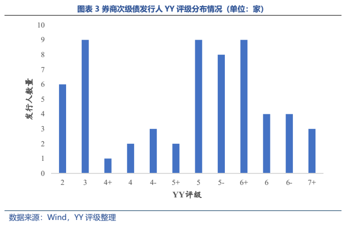 目前現存券商次級債多為可用于補充附屬凈資本的長期次級債,YY評級在2-3以及5-6+的頭部和腰部券商為發行主力,發行人資質整體較優。相對于銀行二級資本來說,券商次級債條款設置較為友好,目前存續債均未附減記條款且永續次級債尚無延期情況出現。收益率分級別來看,頭部和尾部近年分化加大,利差已擴大至200bp。