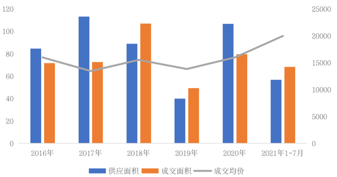 圖:2011年-2021年前7月杭州商品住宅供求量價(jià)(單位:萬平方米、元/平方米)