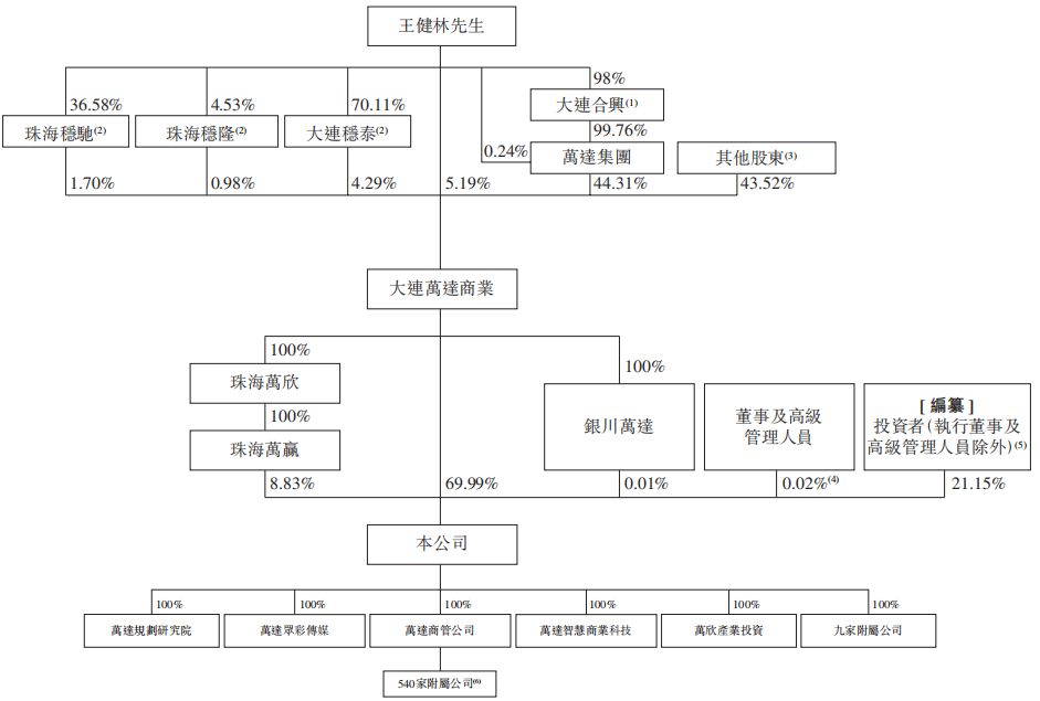 在控股方面,大連萬達商業、珠海萬贏、銀川萬達分別直接持股69.99%、8.83%、0.01%,其余投資者持股21.17%。
