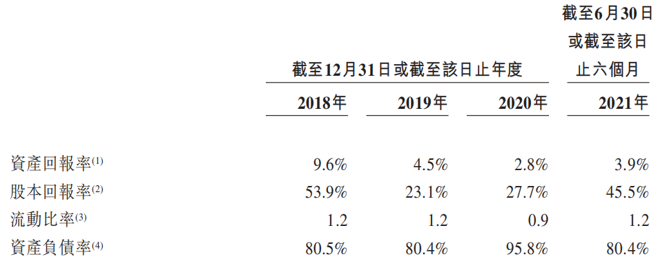 一是其較高的負債,招股書顯示,2018年至2020年,資產負債率分別為80.5%、80.4%、95.8%,2021年上半年資產負債率則為80.4%。整體資產負債率保持穩定,2020年達到95.8%主要是因為其在當年派息達51.78億元。