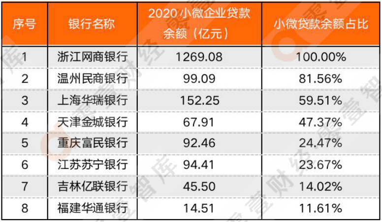 3、 浙江網商銀行和吉林億聯銀行數據來源于新京報、溫州民商銀行根據年報中“普惠小微貸款余額占比”測算所得。4、僅限各家銀行表內數據不含聯合貸。