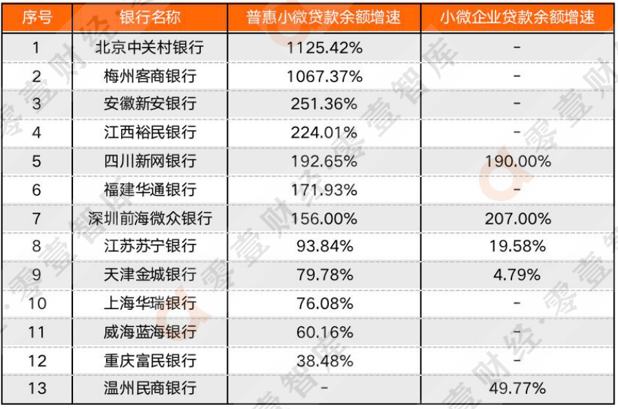 2、 表中主要根據普惠小微貸款余額增速對比,部分銀行披露小微貸款余額增速,放在同一表格中對比。