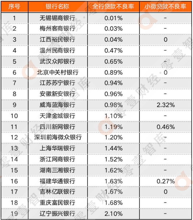 由于民營銀行的信息披露標準化較差,僅有6家銀行披露了小微企業貸款的不良貸款或者不良率情況,針對這一情況,本文將所有民營銀行的全行不良率展示,對比小微不良率,具體數據如下,可作為參考。