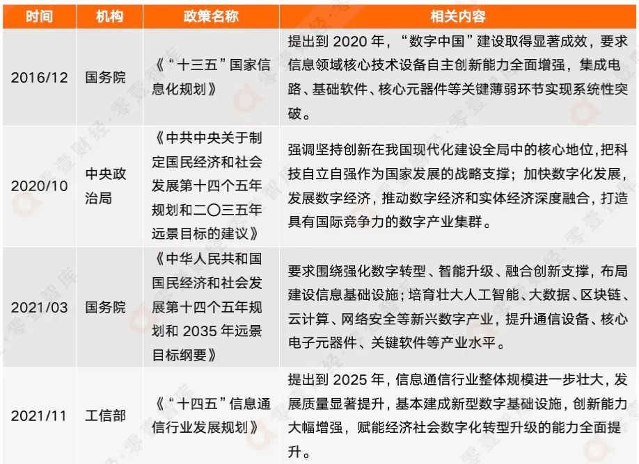 在2021年兩會期間,“數(shù)字化轉(zhuǎn)型”一詞多次被提到,并在《中華人民共和國國民經(jīng)濟(jì)和社會發(fā)展第十四個五年規(guī)劃和2035年遠(yuǎn)景目標(biāo)綱要》中多次出現(xiàn),可見其重要性。在2020年之前,數(shù)字化發(fā)展與信創(chuàng)早已有了聯(lián)系。2016年,國務(wù)院出臺《“十三五”國家信息化規(guī)劃》,要求到2020年,“數(shù)字中國”建設(shè)取得顯著成效,要求信息領(lǐng)域核心技術(shù)設(shè)備自主創(chuàng)新能力全面增強(qiáng)。2020年以后,中央更是直接提出“圍繞強(qiáng)化數(shù)字轉(zhuǎn)型”建設(shè)信息基礎(chǔ)設(shè)施,信創(chuàng)發(fā)展帶來“IT基礎(chǔ)設(shè)施”、“基礎(chǔ)軟件”、“應(yīng)用軟件”、“信息安全”等方面的創(chuàng)新能力的提升,將賦能“經(jīng)濟(jì)社會數(shù)字化轉(zhuǎn)型升級的能力全面提升”。
