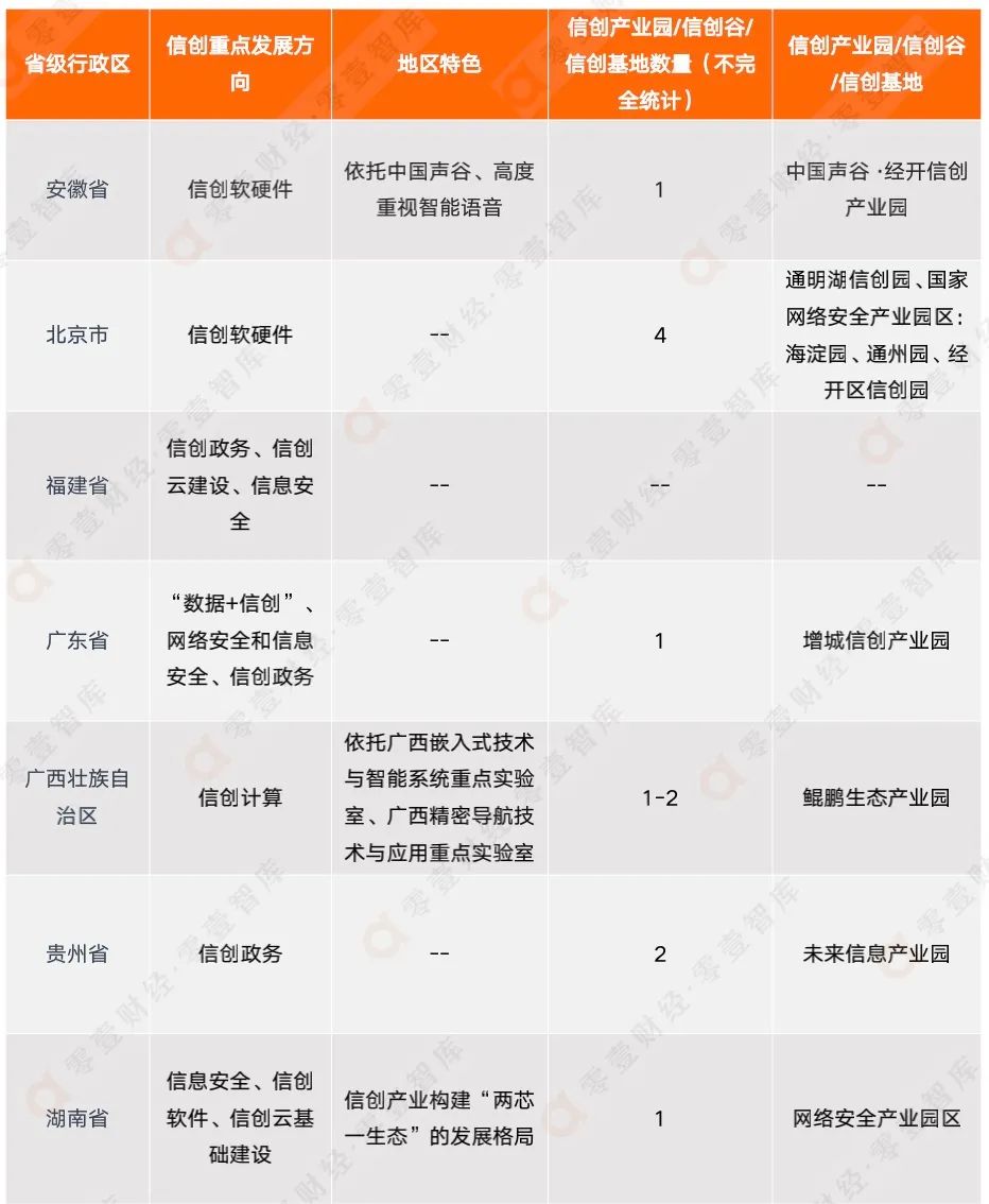 總結(jié)上述信創(chuàng)相關(guān)政策,可以看出各地方的信創(chuàng)發(fā)展重點(diǎn)各不相同,并帶有其獨(dú)特的地區(qū)特色。地方信創(chuàng)發(fā)展重點(diǎn)主要包含四方面:信創(chuàng)軟硬件、信創(chuàng)政務(wù)、信息安全、信創(chuàng)云建設(shè),重點(diǎn)發(fā)展信創(chuàng)軟硬件的研發(fā)和應(yīng)用的地區(qū)有安徽省、北京市、湖南省、天津市,重點(diǎn)關(guān)注信創(chuàng)政務(wù)的地區(qū)包含福建省、廣東省、貴州省、上海市、云南省,重點(diǎn)發(fā)展信息安全的地區(qū)有福建省、廣東省、湖南省、吉林省、四川省,重點(diǎn)發(fā)展信創(chuàng)云建設(shè)的地區(qū)則有福建省、湖南省、寧夏回族自治區(qū)。