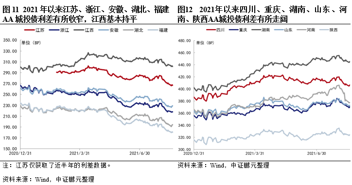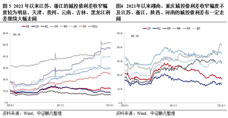 2021年以來全國城投債利差總體有一定收窄,但區域之間利差走勢繼續分化