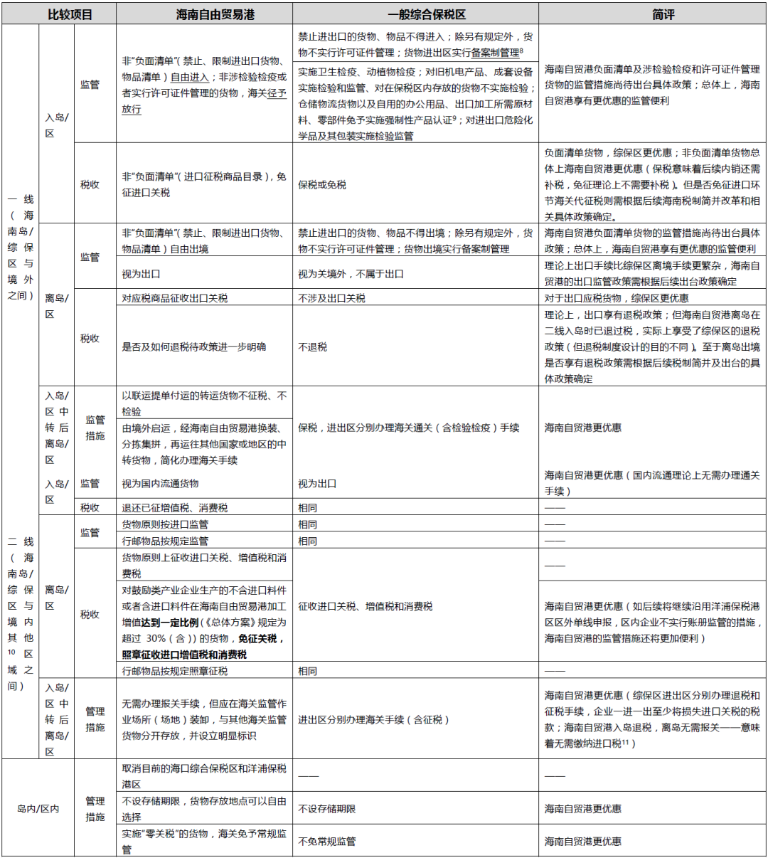 為便于進一步了解海南自貿港海關監管特殊區域制度,我們將其與一般的海關特殊監管區域(以綜合保稅區(以下簡稱“綜保區”)為例)做了比較說明(詳見附件表格)。