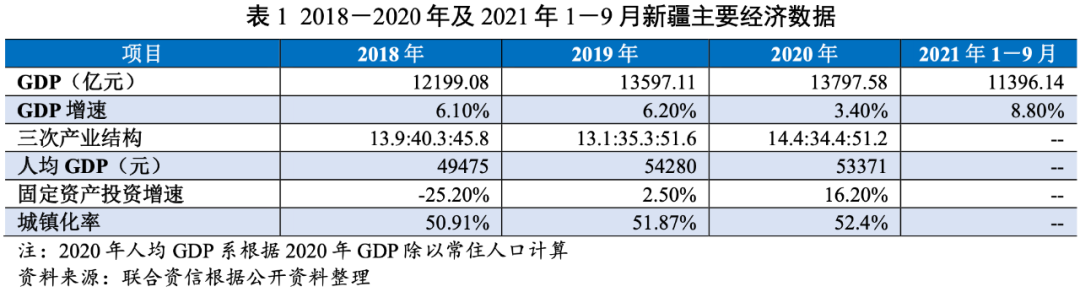 新疆地處中國(guó)西北部,戰(zhàn)略地位重要,資源豐富。新疆經(jīng)濟(jì)總量和人均GDP位于全國(guó)中下游水平,產(chǎn)業(yè)結(jié)構(gòu)以工業(yè)和第三產(chǎn)業(yè)為主。2018-2020年,新疆經(jīng)濟(jì)保持增長(zhǎng),2020年受疫情等因素影響,GDP增速有所下降;2021年前三季度,新疆GDP同比增長(zhǎng)8.8%。