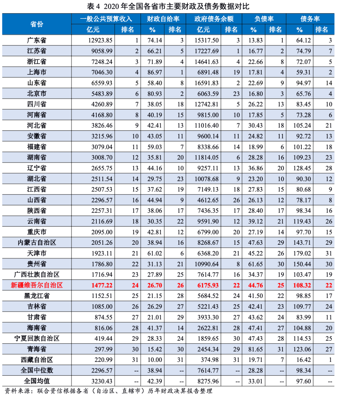新疆一般公共預(yù)算收入居于全國(guó)中下游水平,財(cái)政自給能力較弱,政府性基金收入占新疆綜合財(cái)力的比重不高,地方可用財(cái)力對(duì)上級(jí)補(bǔ)助的依賴程度高。新疆政府債務(wù)余額在全國(guó)排22位,負(fù)債率和債務(wù)率在全國(guó)排名中下游水平,政府債務(wù)負(fù)擔(dān)處于可控范圍。