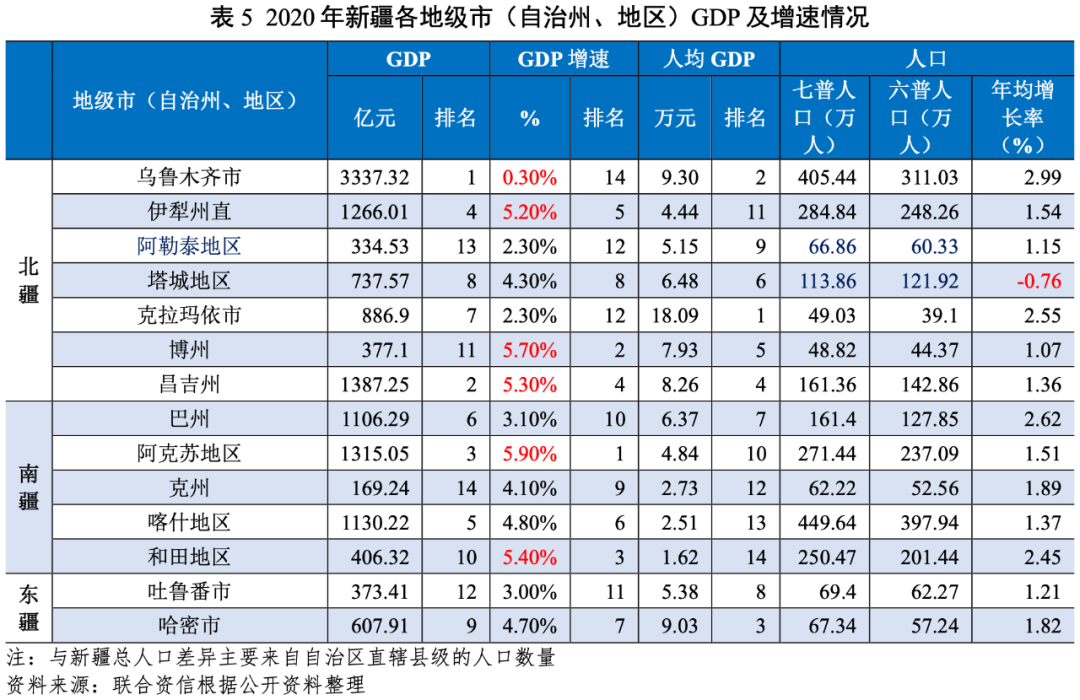 從GDP增速看,2020年,新疆各地級(jí)市(自治州、地區(qū))GDP增速差別較大,其中經(jīng)濟(jì)總量最高的烏魯木齊市GDP增速僅為0.3%,伊犁州直、博州、昌吉州、阿克蘇地區(qū)、和田地區(qū)2020年GDP增速相對(duì)較高,介于5~6%之間。