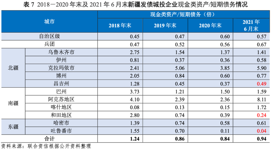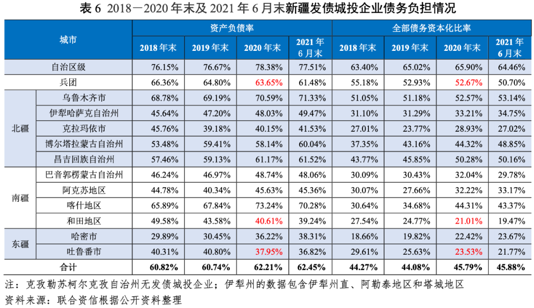 截至2021年6月末,自治區(qū)級(jí)、喀什地區(qū)和烏魯木齊市發(fā)債城投企業(yè)資產(chǎn)負(fù)債率均在70%以上,省級(jí)、兵團(tuán)、烏魯木齊市和昌吉州發(fā)債城投企業(yè)全部債務(wù)資本化比率均在50%以上,債務(wù)負(fù)擔(dān)相對(duì)較重。