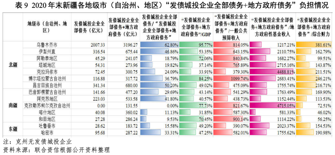 從各地區(qū)債務(wù)負(fù)擔(dān)看,“發(fā)債城投企業(yè)全部債務(wù)+地方政府債務(wù)”/GDP的比值相對(duì)較高的地級(jí)市(自治州、地區(qū))分別為烏魯木齊市、伊犁州直、阿勒泰地區(qū)、博州、克州以及和田地區(qū),均超過(guò)50%,債務(wù)負(fù)擔(dān)重。