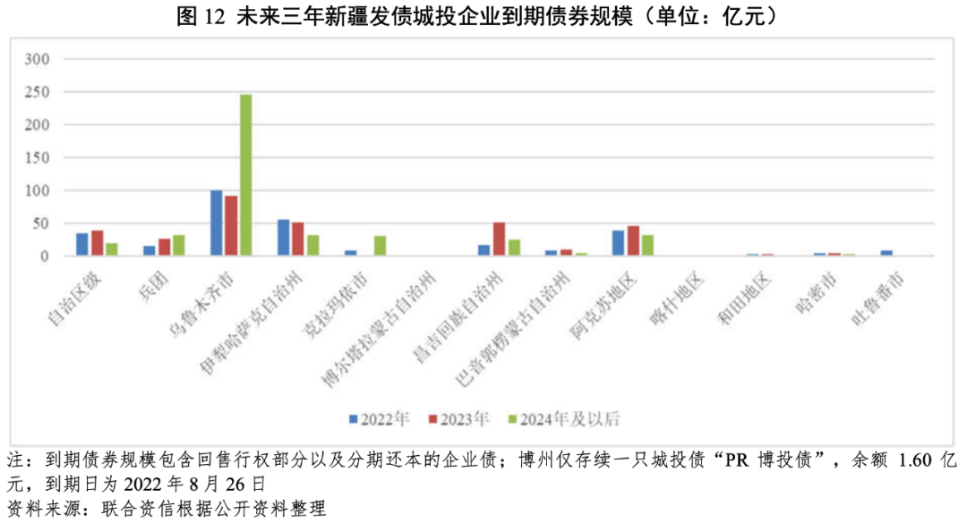 從新疆發(fā)債城投企業(yè)未來(lái)三年(2022-2024年)到期債券規(guī)模看,烏魯木齊市和伊犁州的發(fā)債城投企業(yè)未來(lái)三年集中到期債券規(guī)模較大,自治區(qū)級(jí)、兵團(tuán)、阿克蘇地區(qū)和昌吉州發(fā)債城投企業(yè)到期債券規(guī)模一般,其他區(qū)域城投企業(yè)到期債券規(guī)模較小。