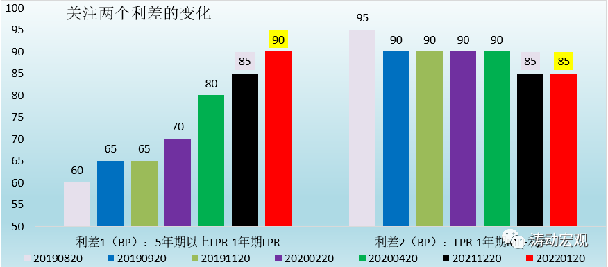 1、1年期LPR與MLF利率之間的利差一定程度上代表著商業銀行的利差空間基準,若擴大,則意味著商業銀行的利差空間基準有所擴大,對商業銀行是利好。不過在目前政策導向下,這一利差空間只要不收窄對商業銀行實際上也算是利好。雖然2021年12月與2022年1月下調兩次1年期LPR和1次MLF利率,但二者之間的利差空間仍然穩定在85BP,對商業銀行來說算是好事。