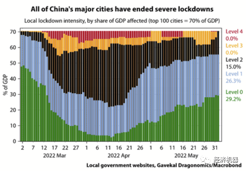 出口增速的大幅反彈主要得益與國內疫情控制下,供應鏈的恢復。整體看,經過1個月的努力,當前疫情基本得到控制,各地的封鎖正在慢慢解除。重點城市如北京已連續多日社會面清零,上海近來社會面新增也屈指可數。在此背景下,上海6月1日開始全面復工復市,北京大部分區域6月6日也宣布正常上班,開放堂食。全國主要城市已經結束嚴重的封鎖,各地的封鎖等級也在不斷下降(圖1)。