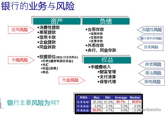 銀行業(yè)業(yè)務(wù)經(jīng)營的范圍也是以貸款為主,收入結(jié)構(gòu)中利差是主要的貢獻(xiàn)因子,杠桿高于證券行業(yè),大約為12.5倍。其負(fù)債端主要為存款,資產(chǎn)端大部分屬于被動式管理,貸款的品質(zhì)好壞決定其損益,貸款資產(chǎn)本身缺乏流動性。銀行業(yè)的資產(chǎn)與負(fù)債需要在利率、到期長短等條件上匹配。銀行業(yè)主要風(fēng)險是信用風(fēng)險及流動性風(fēng)險。從下圖中可以清晰的看出銀行的業(yè)務(wù)及其風(fēng)險。