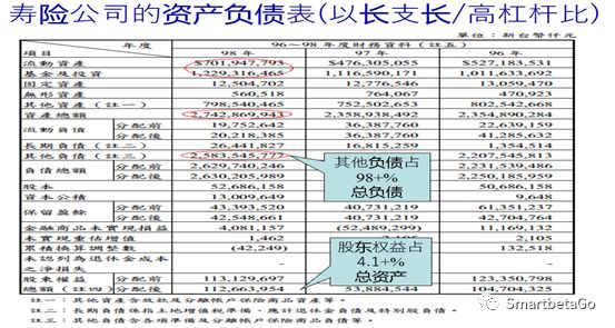 保險業(yè)經(jīng)營范圍以保單銷售為主,收入結(jié)構(gòu)以保險費(fèi)中的三差(費(fèi)差、死差、利差)為主,其杠桿非常大。其負(fù)債端以保費(fèi)收入為主,資產(chǎn)端的運(yùn)用也是相對被動的(做到什么利率的保單就對應(yīng)什么收益率的投資商品),資產(chǎn)與負(fù)債在久期、持倉屬性與現(xiàn)金流量等條件上要匹配。由于保險業(yè)資產(chǎn)運(yùn)用大部分購買固定收益型產(chǎn)品,所以主要風(fēng)險還是信用風(fēng)險。從下圖可以看出壽險公司以長支長及高杠桿比的特征。