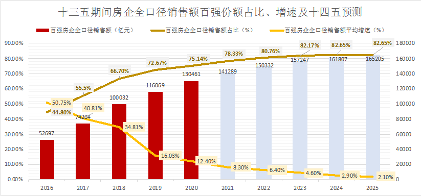 參照十三五期間百強房企銷售額占比,十四五期間百強房企銷售額市場份額仍將繼續上升,預計還有約10%的增長空間;