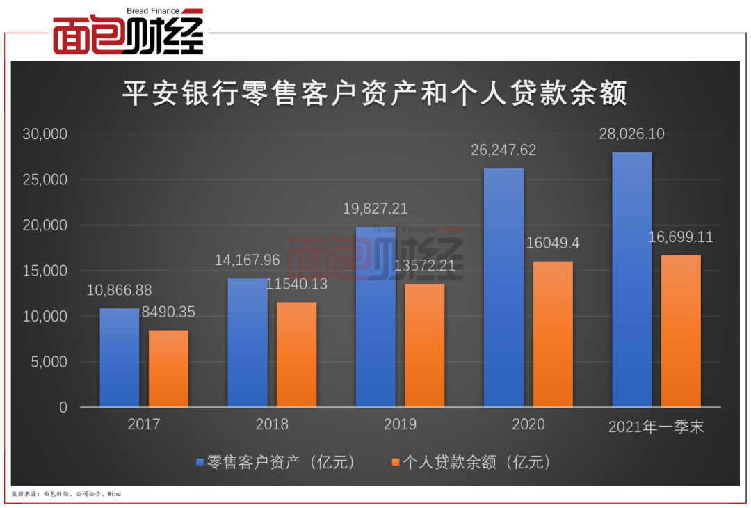 而在總貸款中,該行個(gè)人貸款占比也超越了企業(yè)貸款。截至2021年3月末,平安銀行的個(gè)人貸款余額為16,699.11億元,較上年末增長4.0%,其在總貸款中的占比達(dá)60.1%。