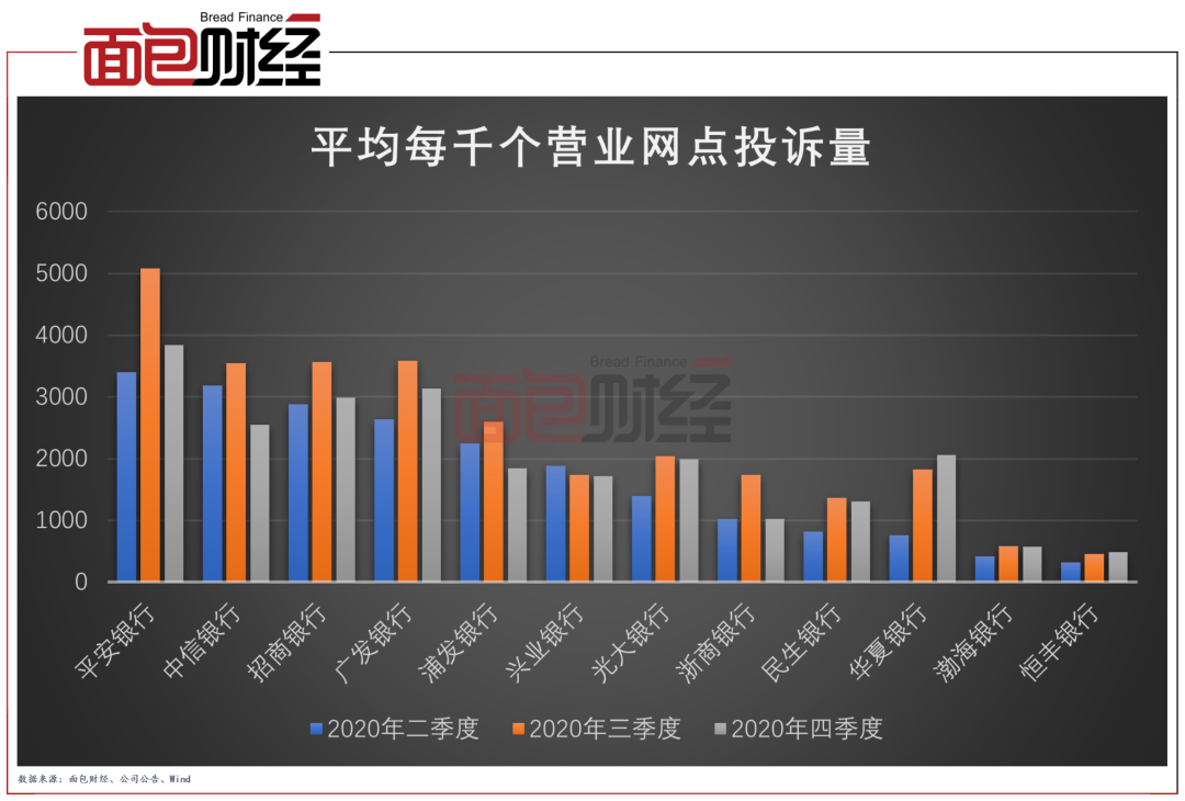 營業(yè)網(wǎng)點(diǎn)雖然不是最多的,但平均投訴量卻較大。數(shù)據(jù)顯示,2020年第二至第四季度,平安銀行平均每千個(gè)營業(yè)網(wǎng)點(diǎn)的投訴量分別為3396件、5076.6件和3842.2件。