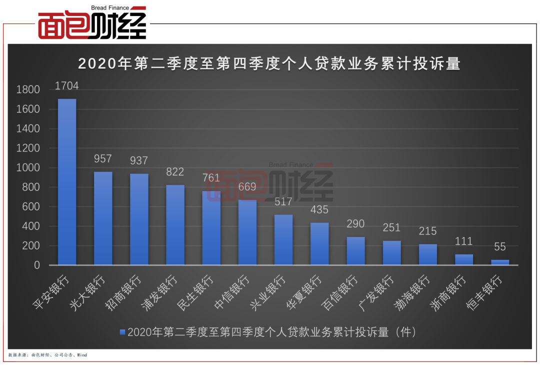 數(shù)據(jù)顯示,2020年第二至第四季度,股份制商業(yè)銀行個(gè)人貸款業(yè)務(wù)投訴量的中位數(shù)分別為128件、230件和196件。平安銀行的投訴量已經(jīng)遠(yuǎn)超中位數(shù)水平。三個(gè)季度個(gè)人貸款業(yè)務(wù)投訴量累計(jì)達(dá)1704件,高居股份制銀行之首。