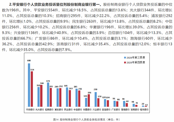根據(jù)中國銀保監(jiān)會消費(fèi)者權(quán)益保護(hù)局關(guān)于銀行業(yè)消費(fèi)投訴情況的通報(bào),平安銀行的理財(cái)類業(yè)務(wù)投訴量在2020年第二季至第四季度均居股份制商業(yè)銀行首位,數(shù)量分別是470件、680件和554件。