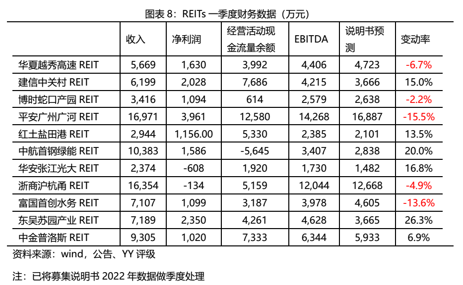一批基礎設施公募REITs2022年一季報已經披露,總體來看,各只業績有所分化。9單公募REITs的一季度凈利潤為正,而華安張江光大REIT和浙商滬杭甬REIT分別虧損608萬元、134萬元。華安張江光大REIT系因項目折舊年限較短,本期折舊攤銷較大導致本期虧損,實際上一季度營業收入穩健,而浙商滬杭甬REIT受其高速公路周邊地區疫情影響,一季度通行車輛總數同比下降5.93%。另外3只高速公路類REIT、博時蛇口產園REIT受疫情影響,EBITDA不及募集說明書預期,富國首創水務REIT受季節性影響,亦低于募集說明書預測值的13.6%。除此之外,其他公募REITs整體運營情況良好,EBITDA表現均超預期。