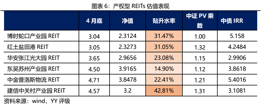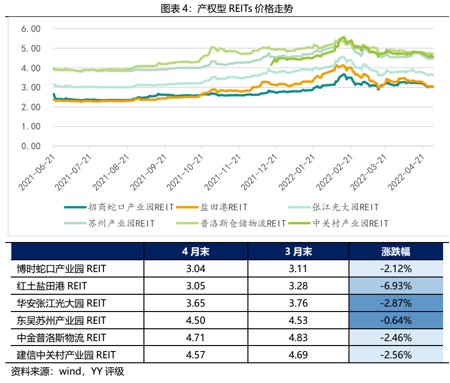 四月中上旬產權型REITs整體上揚,中下旬回調明顯,整體呈下跌走勢。其中紅土鹽田港REIT月底收盤價為3.05元,相比于3月底下跌6.93%,跌幅最大;跌幅最小的是東吳蘇州產業園REIT,4月最后一個交易日收于4.5元,相比于3月底下跌0.64%。