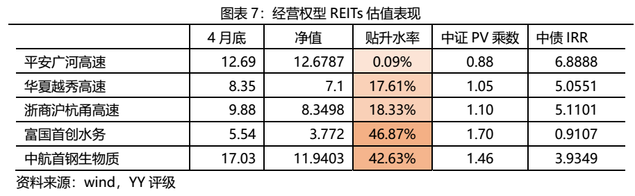 平安廣河高速REIT的市值較上月增加,目前已超過其凈值。兩只生態環保類REITs的升水率仍保持在40%以上。對比中證PV乘數,平安廣河高速REIT的市值仍小于其ABS估值,且其中債IRR也處于高位。富國首創水務REIT的市值已明顯高于其ABS估值,中證PV乘數最大,中債IRR最小。