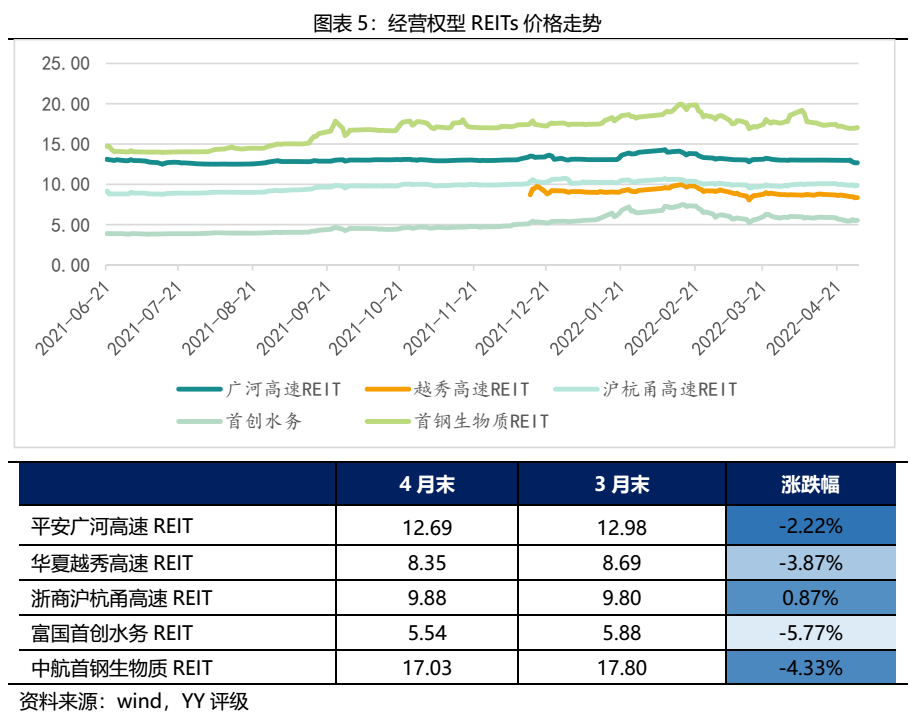 經營權型REITs四月價格走勢基本和產權型REITs保持一致。跌幅最大的依舊是富國首創水務REIT,月底收盤價為5.54元,相比于3月底下跌了5.77%;另外浙商滬杭甬高速REIT是唯一一只上漲的產品,月底收盤價為9.88元,相比于3月底上漲了0.87%。