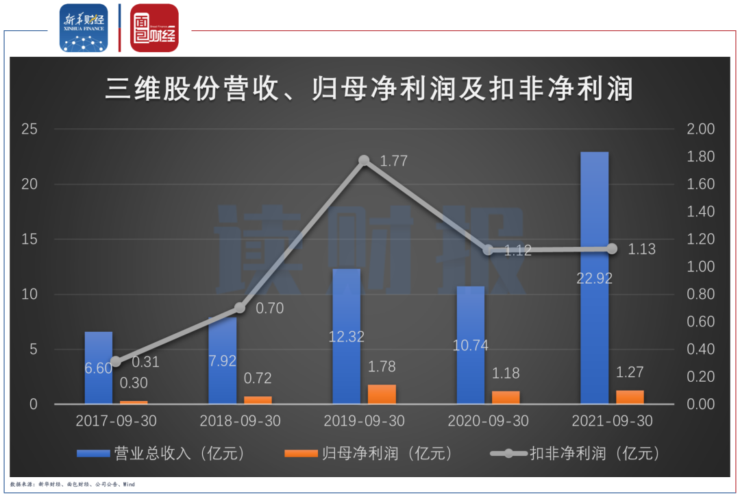 圖1:2017Q3-2021Q3三維股份營收、歸母凈利潤及扣非凈利潤