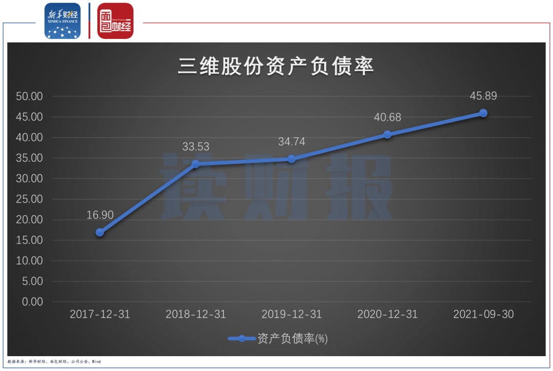 債務的增加也使得公司的資產負債率不斷上升。截至2021年9月末,三維股份的資產負債率為45.89%,較2020年末上升5.21個百分點。