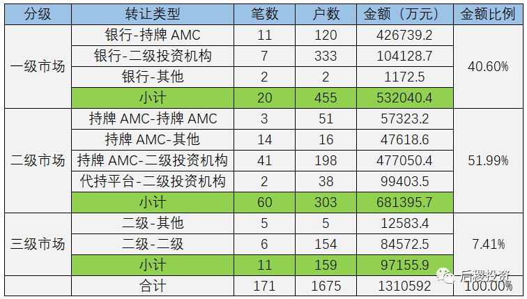 按慣例,我們將行業市場分為三級:銀行出讓債權為一級市場;本地持牌AMC或代持機構在當地出讓債權為二級市場,其余的債權轉讓為三級市場。