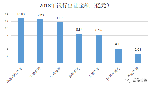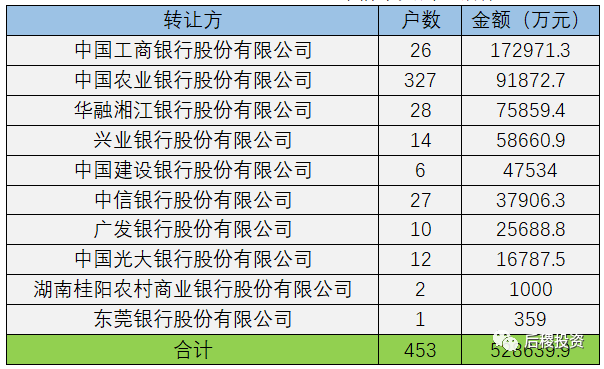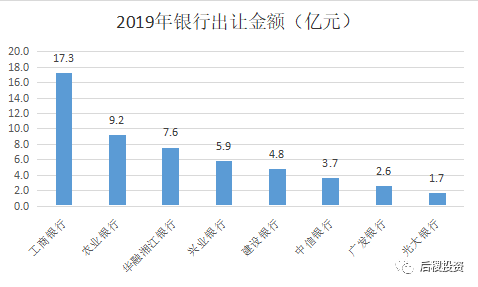 從上圖看,工商銀行出讓金額遙遙領先,其出讓金額是農業銀行與湘江銀行的總和,大型國有銀行中,工行、建行進入榜單前五,但出讓金額與其他銀行相差不大。